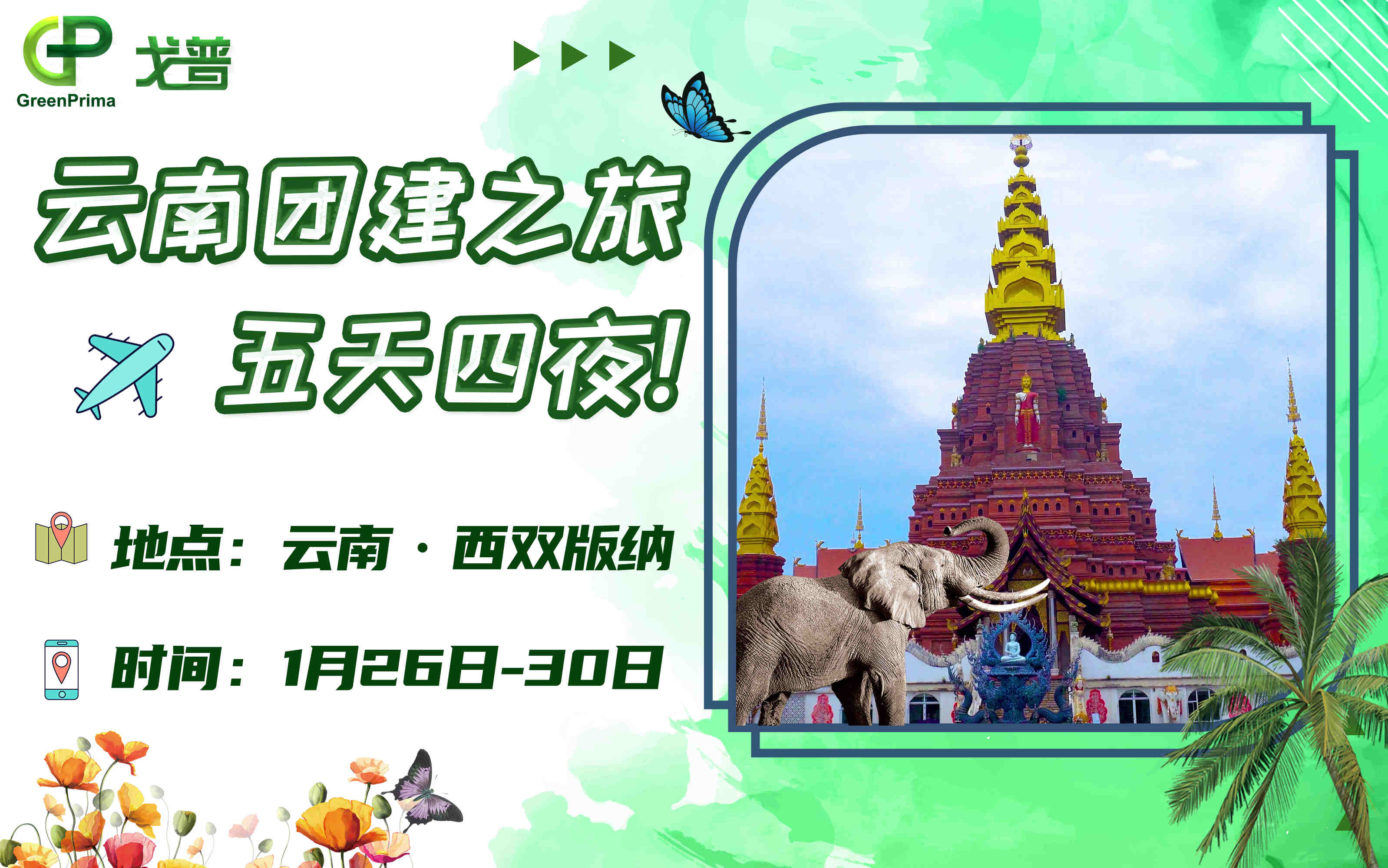 戈普公司將于2024年1月26至30日進(jìn)行五天四晚的西雙版納團(tuán)建活動(dòng),請(qǐng)各位同仁安排好手頭工作,向快樂出發(fā)!